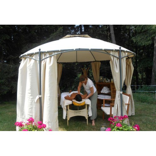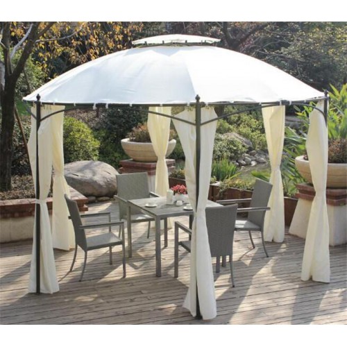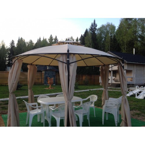 Плотные шторы для шестиугольной беседки представлены в бежевом цвете, который хорошо отражает солнечные лучи. Благодаря легкости ткани даже при закрытых полотнах внутри конструкции поддерживается оптимальная циркуляция воздуха.