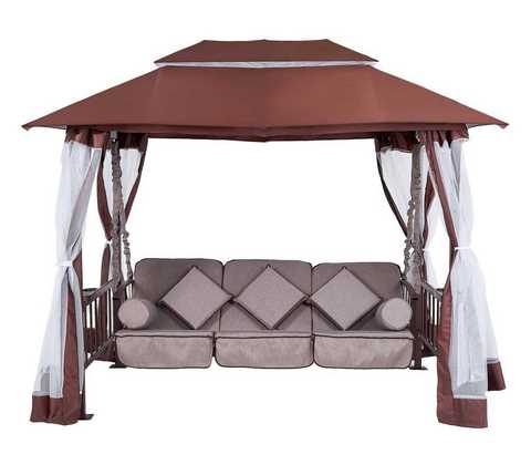 качелей может сильно трескаться и облазить, а металл в тот момент, когда он контактирует с водой, будет подвергаться воздействию коррозии. Кроме того, негативно повлиять на лакокрасочное покрытие могут и ультрафиолетовые лучи, в данном случае краска будет шелушиться и отпадать, а цвет не будет таким ярким. Кроме того, выгореть могут и мягкие элементы, они будут выглядеть не так привлекательно. Благодаря тенту, предназначенному для садовых качелей можно защитить качели от падающих веток и птичьего помёта, из-за чего летний отдых станет хуже. Качели, у которых есть тент, выглядят намного более привлекательно, что тоже является огромным преимуществом в пользу выбора тента. Также такой тент может продаваться вместе с противомоскитной сеткой, благодаря чему вы также будете защищены от насекомых, которые сильно могут омрачить летний отдых.